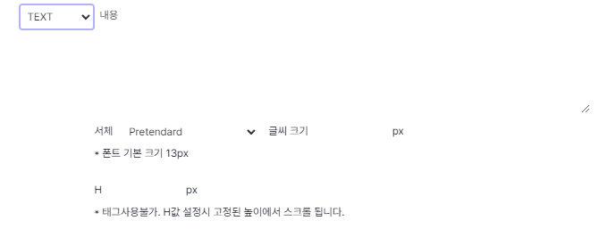 텍스트 칸에 서체와 글씨 크기를 설정하여 올릴 수 있도록 하였습니다.